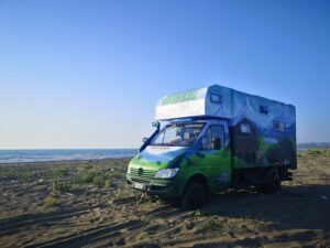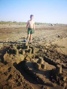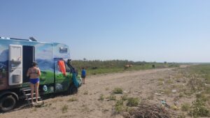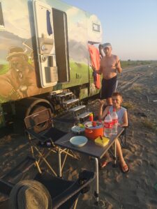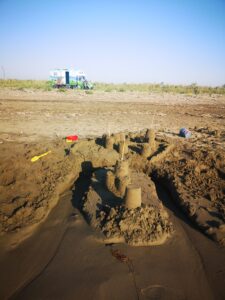 Nous avons dormi 2 nuits au calme sur cette plage. Hier c’était baignade et château de sable au programme car c’est la première que ce n’est pas une plage de galets. Nous avons croisé des pêcheurs, des promeneurs et un troupeau de vaches ! Le soir on est seuls avec notre feu de camp.