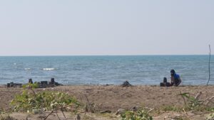 On roule pas mal pour rejoindre une forteresse que j’avais envie de visiter. On passe devant mais on décide de la voir de plus près au retour et on continue jusqu’à la mer. On s’engage sur un petit chemin pour s’éloigner des bars de plage et immense plage rien que pour nous !