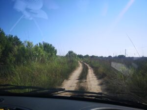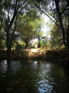 On continue un bout la route et on trouve un super coin discret, à l’ombre au bord de la rivière. C’est David qui manœuvre pour descendre en marche arrière dans le terrain (vive le 4×4 !). Moi je sors du véhicule pour faire semblant de le guider mais j’avais trop peur de rester à l’intérieur !