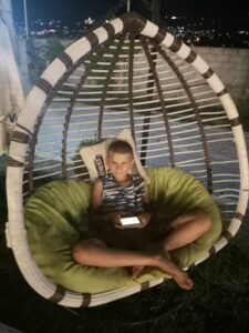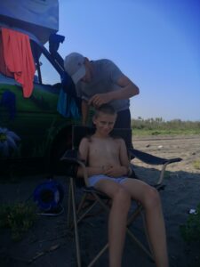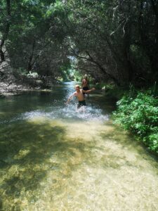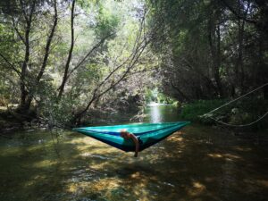 Là on est posés au bord de la rivière pour l’après-midi. Elle est fraiche, ça fait tellement de bien de s’y tremper car il fait à nouveau 37 degrés. David installe un hamac au-dessus de l’eau qui se transforme rapidement en balançoire pour Samuel.