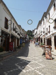 En fin de matinée, nous sommes allés à Gjirokastër. On mange au restaurant, spaghettis pour Sam, David teste la moussaka et moi des boulettes de riz dont je ne me rappelle plus le nom ! C’est très bon et on est agréablement surpris au moment de payer… avec les boissons et le café ça nous coûte 15.- !