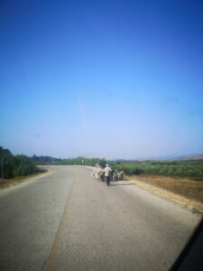 Pour commencer, visite d’Antigone, ruines d’une ville d’il y a 2300 ans. Intéressant mais il faisait déjà chaud. On a jamais vu autant de sauterelles sauter devant nous ! Sur la route pour y aller nous avons croisé : moutons, chèvres, ânes et tortues ! Et visite gratuite car il n’y avait personne à l’entrée.