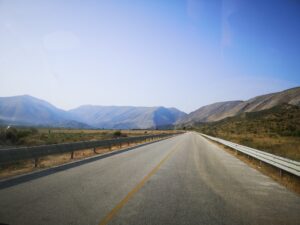 Bye bye Monténégro, bonjour Albanie ! Petite route sinueuse et bien endommagée pour rejoindre la frontière. Heureusement c’est David qui conduit, moi je pense que ça va devenir plus rare !