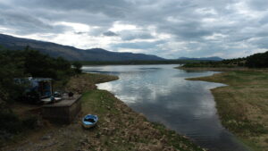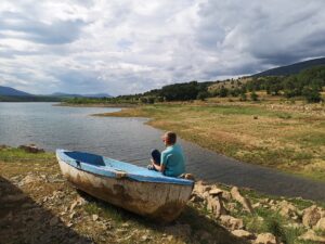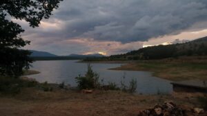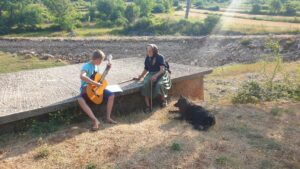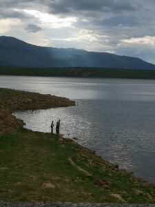 Après avoir beaucoup roulé, arrêt dans les terres, au bord d’un lac et seuls au monde ! David et Samuel se baignent dans ce lac (Peruca). Pas pour moi, pas envie après la mer ! Le soir on entend au loin une chorale dans le village.