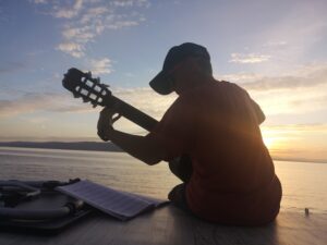 Nous sommes sur une aire pour les camping-cars en bord de mer. Il y a deux rangées et ce matin nous avons pu changer pour être direct en face de la mer. Avec la plaque ouverte c’est trop la classe ! Samuel (et nous aussi !) s’éclate à observer les poissons avec son masque.