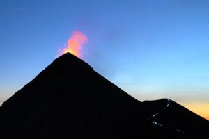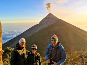 On arrive tous chez Elvin pour un petit déjeuner guatémaltèque bien nourrissant. Puis un dernier petit trajet en bus et nous voici à 2400 mètres au pied du volcan Acatenengo sur lequel on va monter. Montée pas facile pour nous qui ne sommes pas super sportifs ! Avec plusieurs pauses dont une pour dîner, on arrive à notre camp au bout de cinq heures de marche. On s’allonge un moment dans notre tente pour se reposer et quand on en ressort, bonne surprise, les nuages s’éloignent et on est pile en fac du volcan Fuego. C’est trop fou ces explosions et le son en plus qu’on avait pas depuis le camping. Certaines sont tellement fortes qu’on ressent le sol trembler.