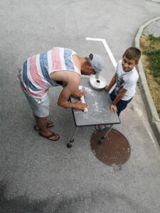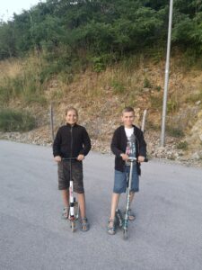 Samuel fait la connaissance de Samuel, même âge, mêmes sandales (!), qui voyage ave ses parents. Ils sont sur le chemin du retour pour la France (Moselle) après 6 mois de voyage. On invite les parents à prendre l’apéro. C’est très sympa d’échanger et ils nous donnent des bons plans pour la Grèce. On a hâte !