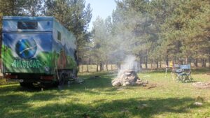 Ensuite nous avons pris la route en direction de la frontière. En chemin les paysages ont commencé à reverdir puis on a revu des arbres et des forêts ! ça faisait longtemps. Fatigués des jours précédents on décide de s’arrêter dans une forêt, on se trouve un joli coin dans une clairière. On se croirait sur le Jura !