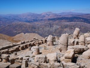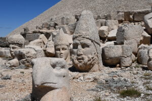 Avant-hier nous avons grimpé à plus de 2000 mètres d’altitude pour aller admirer le site de Nemrut Dagui. La vue de là-haut était magnifique. Très beau ces statues dont les grandes têtes sont posées au sol à présent. Et le tumulus, immense colline de cailloux qui recouvre le tombeau du roi, était très impressionnant.