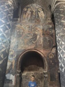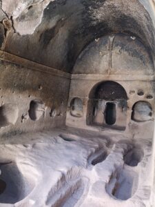 On se rapproche gentiment de la Cappadoce et cet après-midi, visite du monastère Gümüsler creusé dans la roche. C’était magique, on a pu descendre dans des salles au sous-sol en empruntant des couloirs très étroits. Déconseillé aux claustrophobes !