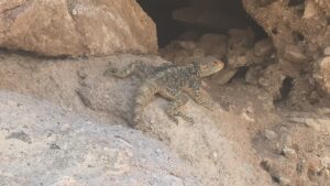 Il y avait beaucoup de petits trous aux alentours de notre campement et on se demandait quelles bêtes inquiétantes s’y cachaient. A la nuit tombée, David qui buvait son café dehors nous dit « venez j’ai vu la bête la plus chou du monde ! » On sort, on patiente et par chance elle ressort et se promène devant nous. Une sorte de gerbille, en tous cas un petit rongeur qui saute comme un kangourou !